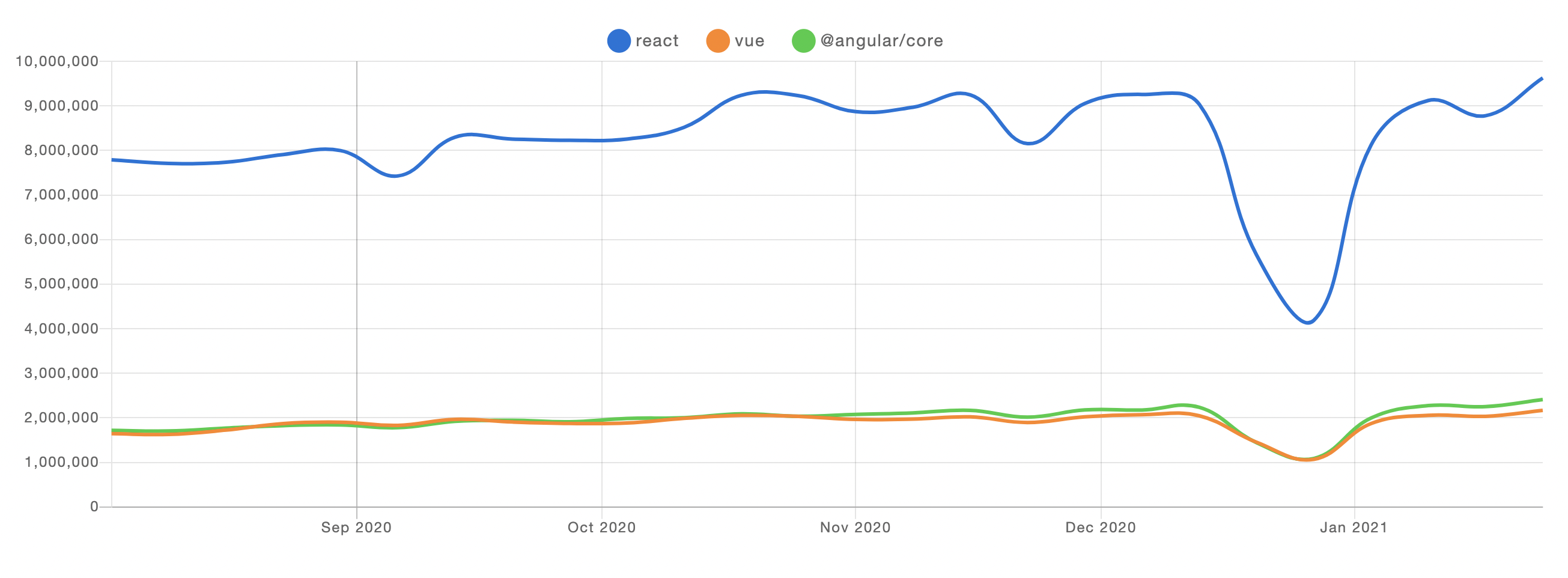 여기서 React의 실사용률을 가늠해보자면 Angular 그리고 Vue와 비교해봤을 때 다운로드 수가 4.5배나 높다.